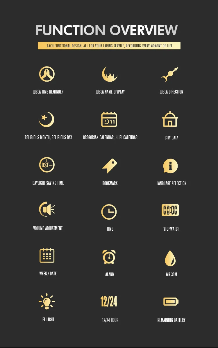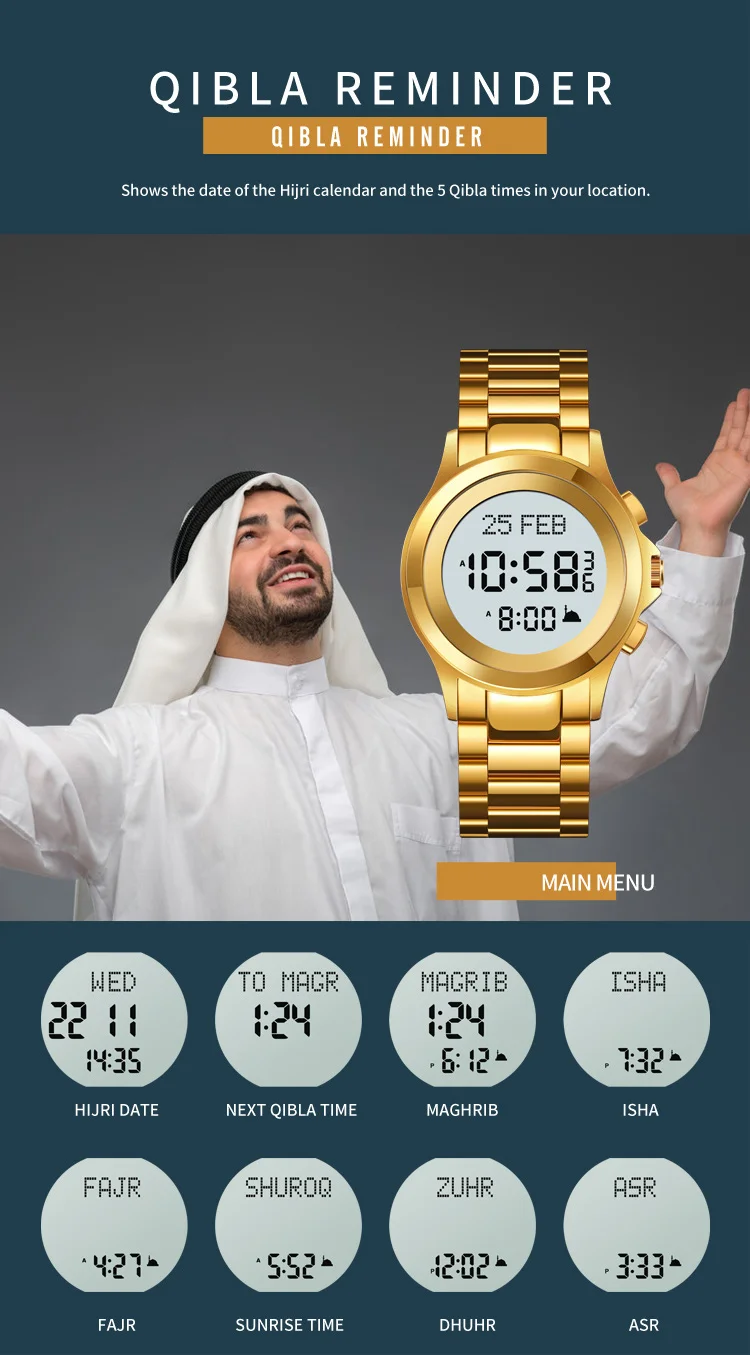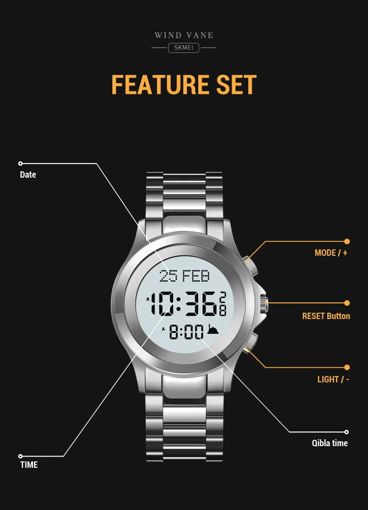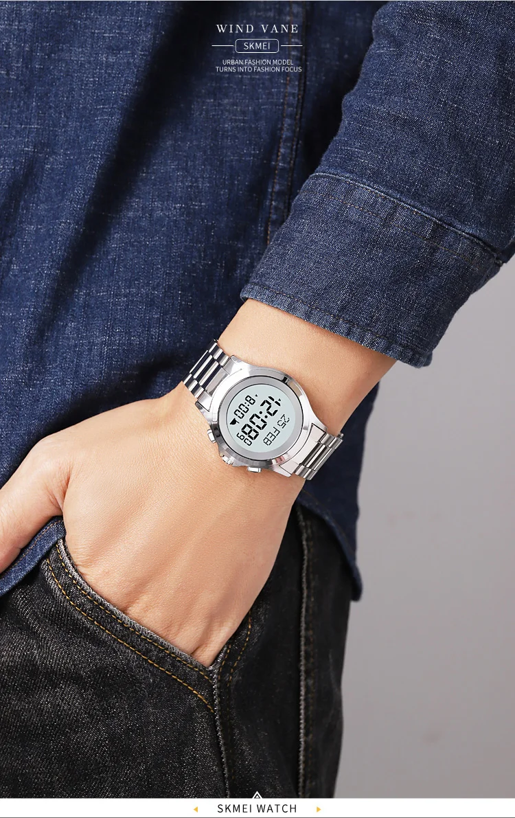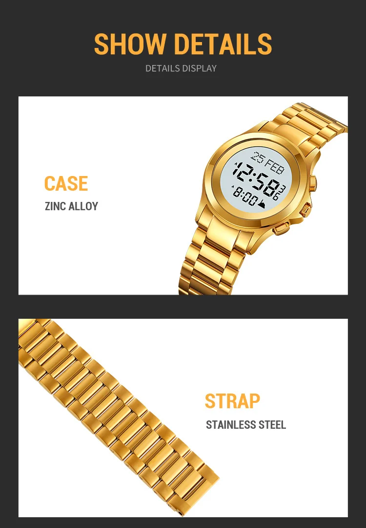 ساعة آزان إسلامية رقمية من SKMEI ، شاشة عرض بإضاءة ليد ، ساعة رياضية ، ساعة هجري للحج ، ساعة بخاصية تحديد اتجاه القبلة